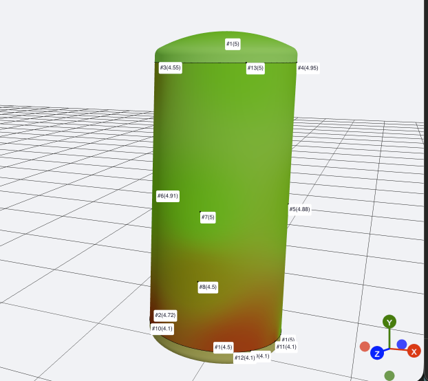 Modelos 3D interativos que mostram a condição real de cada componente. Não é só visual: é uma ferramenta de decisão. Clique em qualquer ponto de medição e veja os dados de espessura, taxas de redução de espessura e histórico.